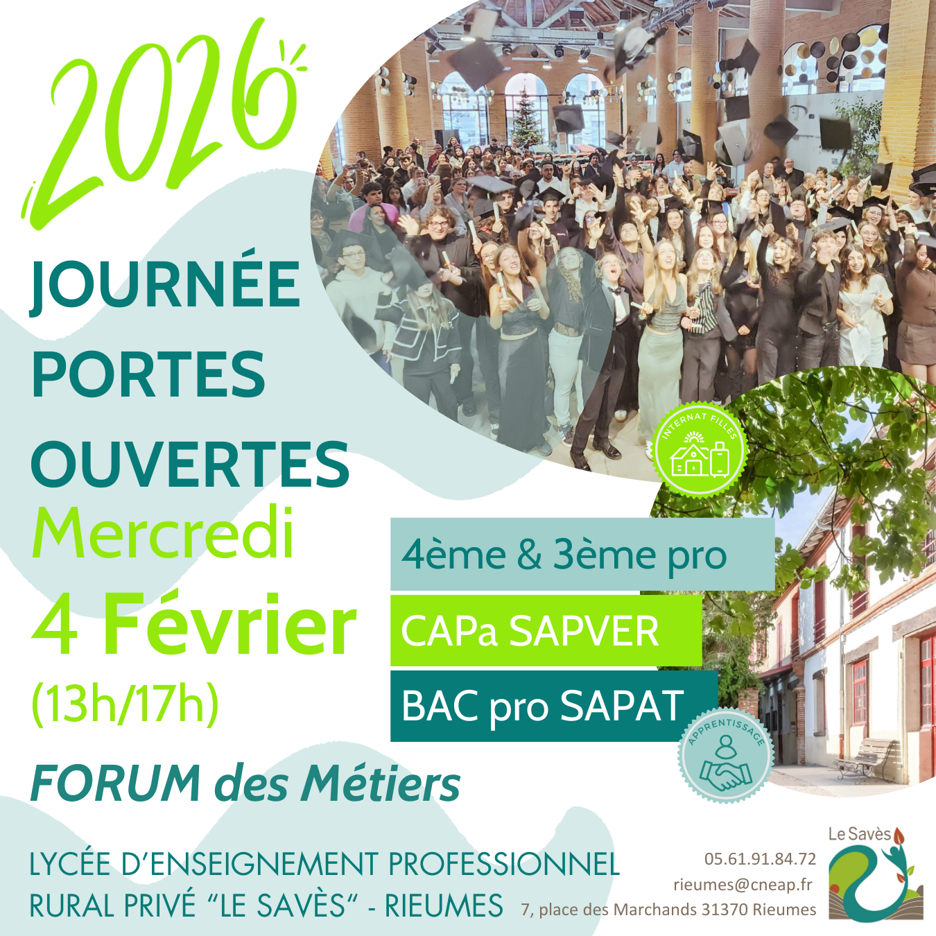 MERCREDI 4 FÉVRIER 2026, de 13h à 17h, le LEP "Le Savès" organise sa 1ère journée portes ouvertes de l’année 2026 et propose en parallèle un Forum des métiers !
